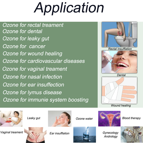 | Applications | Minor&Major autohaemotherapy, Rectal insufflation, Ear Insufflation, ozonated oil, Wound healing,Vaginal treatment,Steam Sauna,Diabetes mellitus, Ozone Bagging etc |